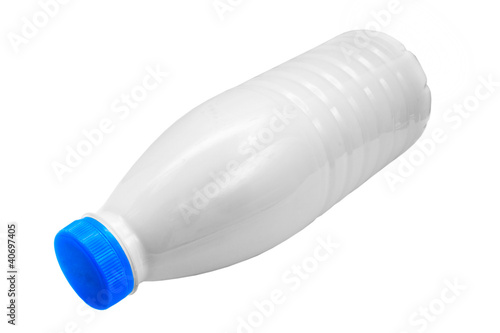 plastic milk bottle lies on side isolated on white (clipping pat