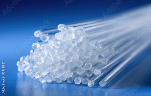 Plastic pellets are in contrast with clear pipette tips on a blue background, showcasing laboratory materials and tools