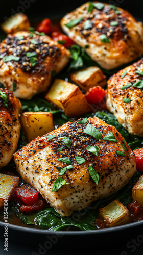 Plate of chicken and potatoes with parsley on top. The dish looks delicious and inviting. The chicken is cooked and seasoned, and the potatoes are seasoned as well. The parsley adds a pop of color