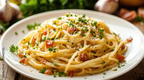 Plate of spaghetti carbonara with creamy sauce and crispy pancetta, garnished with parsley.