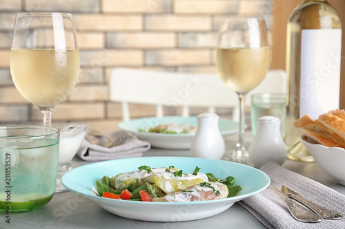 Plate with stuffed cabbage leaves and sour cream on table