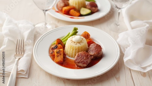Plated meat medallions alongside chicken filet with mashed potatoes and vegetables, emphasizing nutritious meal presentation