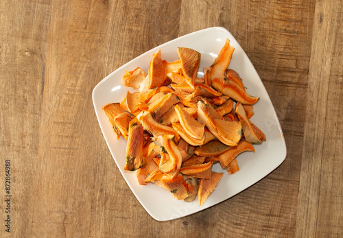 Plato de setas picadas frescas y lavadas. Plato de Lactarius deliciosus, níscalo, delicioso níspero, níspero de azafrán o seta de pino rojo listo para cocinar. Madrid, España.