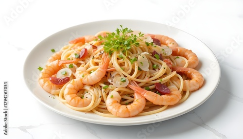platter with fresh oignons, linguini shrimp, and a white backdrop