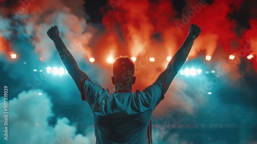 Player celebrating a goal, arms wide, stadium lights flaring
