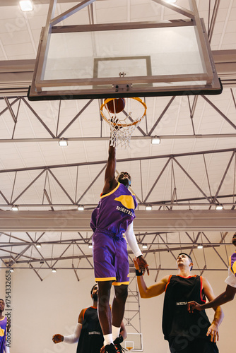 Players competing in basketball match indoors