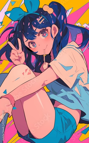 Playful 80s Anime Girl with Blue Hair and a Bright Smile