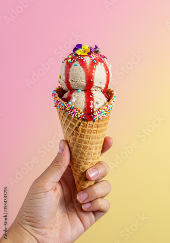 Playful and vibrant vegan ice cream cone against a colorful pastel background. Great for summer food branding and sweet treat visuals.