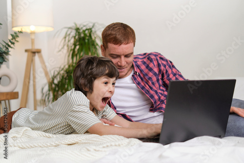 Playful boy interrupts dad's break from work to watch TV shows, creating a fun and lively atmosphere.
