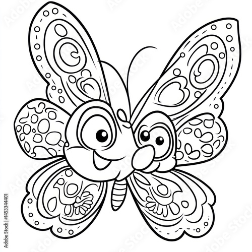Playful Cartoon Butterfly Illustration with Heart and Dot Patterns for Kids' Coloring Pages