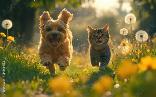 Playful Dog and Cat Running Together Through a Flower-Filled Meadow Surrounded by Bright Dandelions and Soft Sunlight
