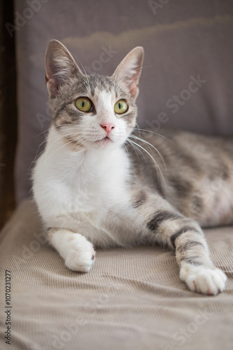 Playful Gray Tabby Cat with Yellow Eyes Relaxing Peacefully