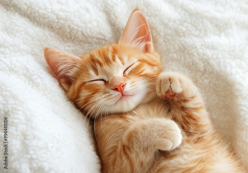Playful orange kitten sleeping peacefully on a cozy knitted blanket in soft morning light