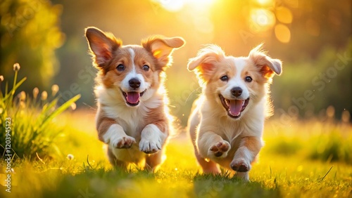 Playful Puppies Romping in Sunlight: Adorable Dog Siblings Enjoying Outdoor Fun