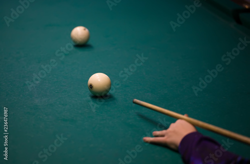 Playing billiard. Billiards balls and cue on green billiards table. Russian pyramid.