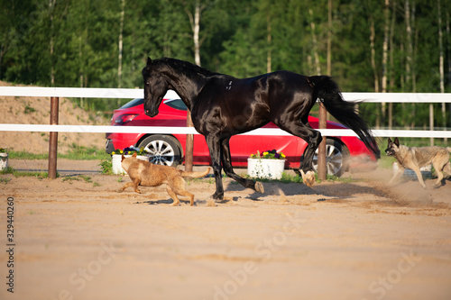 playing black beautiful stallion with dogs in paddock. TRakehner sportive breed