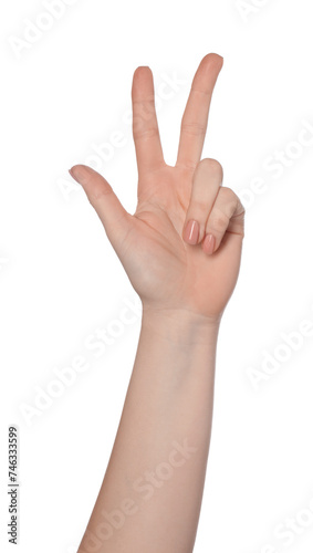 Playing rock, paper and scissors. Woman making scissors with her fingers on white background, closeup