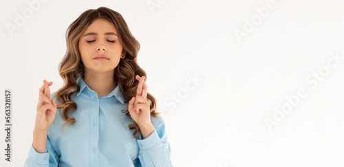 Pleased cheerful brunette woman puts all efforts in wishing good luck, crosses fingers, has faith for better, dressed in blue shirt, isolated over white background. People, body language concept