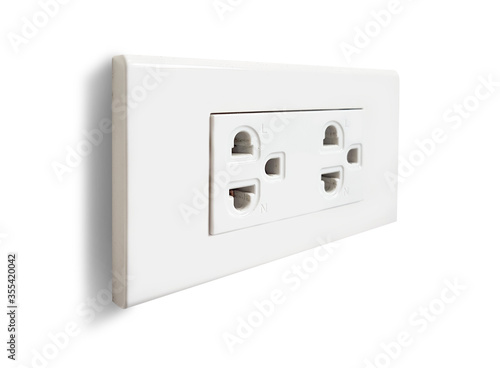 Plug socket mounted on a white wall, Side photo