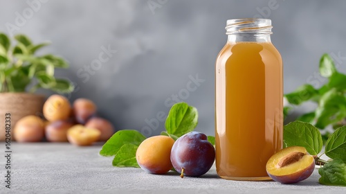 Plum juice in a glass bottle with fresh plums.