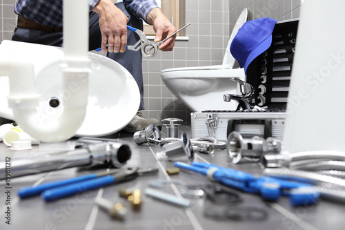plumber at work in a bathroom, plumbing repair service, assemble and install concept