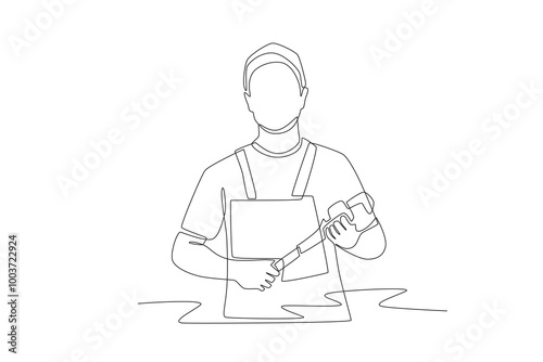 Plumber holding pipe wrench. Plumber concept one-line drawing