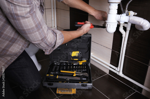 Plumber repairing sink pipe in bathroom