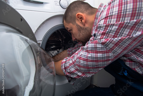 Plumber repairing washing machine in bathroom