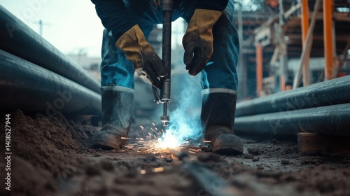 Plumber welding pipes at a construction site. Featuring expertise and focus