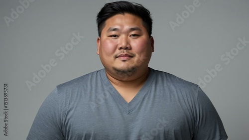 Plus size Asian man plain gray background, looking proud