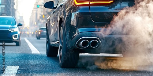 PM 2.5 fine dust concept. A black car emitting exhaust smoke while driving in an urban street setting.