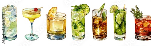 PNG collection of Manhattan cocktails in different glasses with garnishes. Watercolor illustrations on transparent background. Classic cocktail variety set. High quality