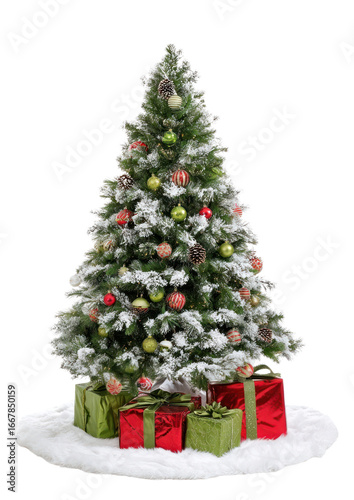 PNG Green christmas tree with snow on branch decorated beautifully branches gifts white.