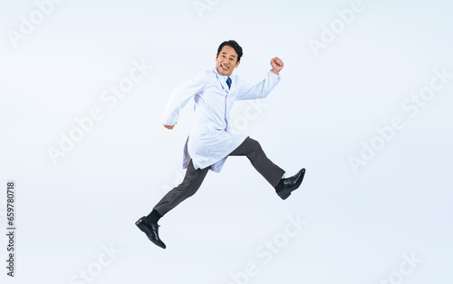 ジャンプする白衣を着た中年男性 医師 科学者(切り抜き背景透過PNGも販売しております。作成者リンクから「PNG」で検索してください)