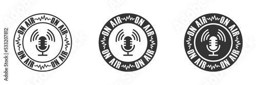 Podcast icon with "on air" lettering. Live symbol. Vector illustration.