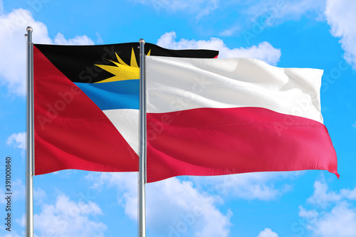 Poland and Antigua and Barbuda national flag waving in the windy deep blue sky. Diplomacy and international relations concept.