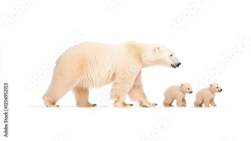 Polar bear and two cubs walking across a snowy landscape, showcasing family bonding in nature
