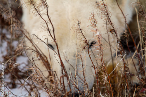 Polar Bear Hidden Among Winter Drying Weeds & Snow