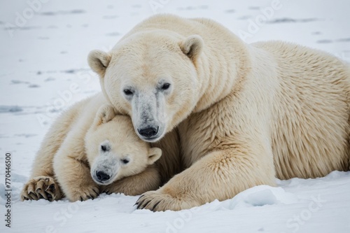 Polar bears (Ursus maritimus), polar bear mother and young sleeping in the snow