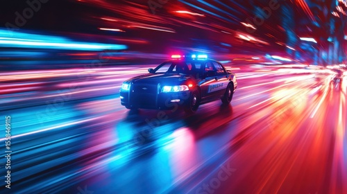 Police car racing through neon city streets at night dynamic action shot urban environment motion blur