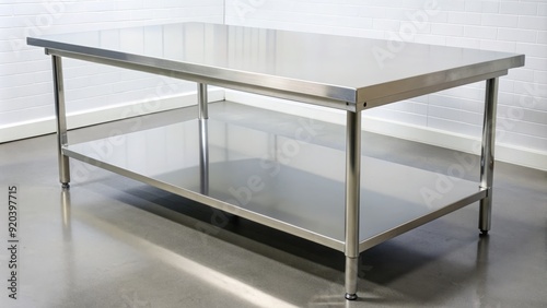 Polished stainless steel table with sleek modern design, reflective surface, and clean lines, ideal for commercial kitchens, laboratories, or industrial settings.