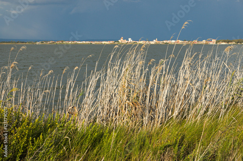 pond of Cabras with the town in the background, Sardinia, Italy