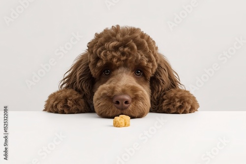 Poodle dog is eating food placed on the table with hopeful look, pet, pet cuteness, pet feeding, snack time, meal time, dog, focus, micro, white background