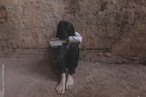 poor child sitting alone in old room.concept for bullying, depression stress or frustration.
