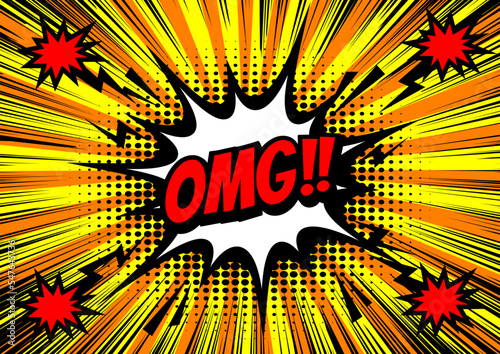 Pop art style, Comic book concept speech bubble OMG. Illustration halftone dot versus comic. Comics book template background. Pop art colorful backdrop.