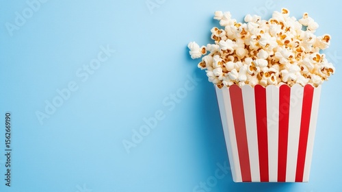 Popcorn in a striped container against a light-blue background.