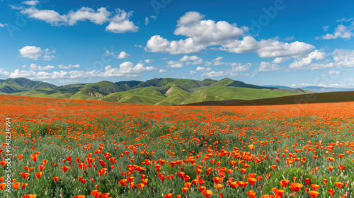 Poppy field in vibrant red with a backdrop of rolling green hills