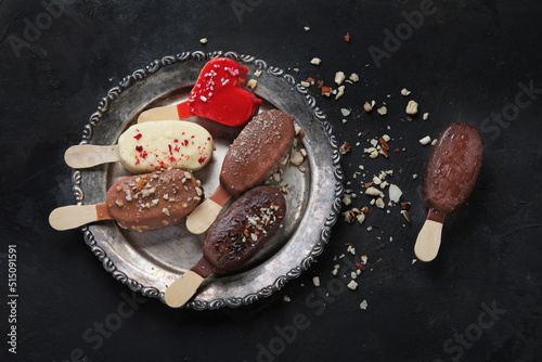 Popsicle ice-cream assortment on dark background.