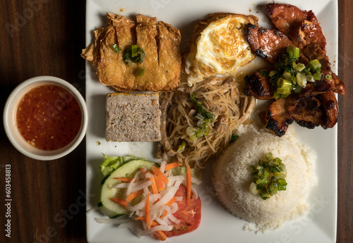 Pork chop, pork skin, steamed pork cakes, fried egg and rice