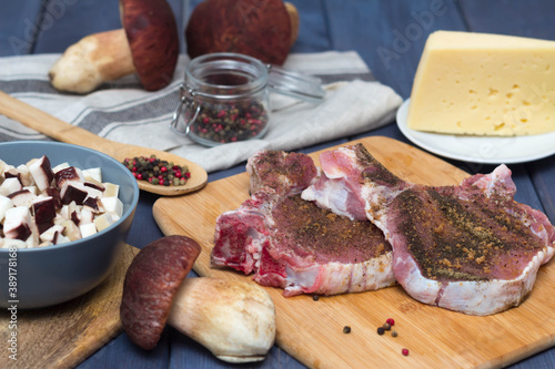 pork entrecote with mushrooms, tomatoes and cheese. intercote cooking